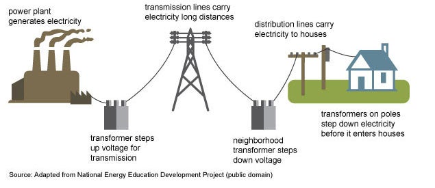 - Local transformers, mounted on poles or on concrete pads, further reduce the electric voltage to 110–220 volts, which can be used safely in businesses and homes.
